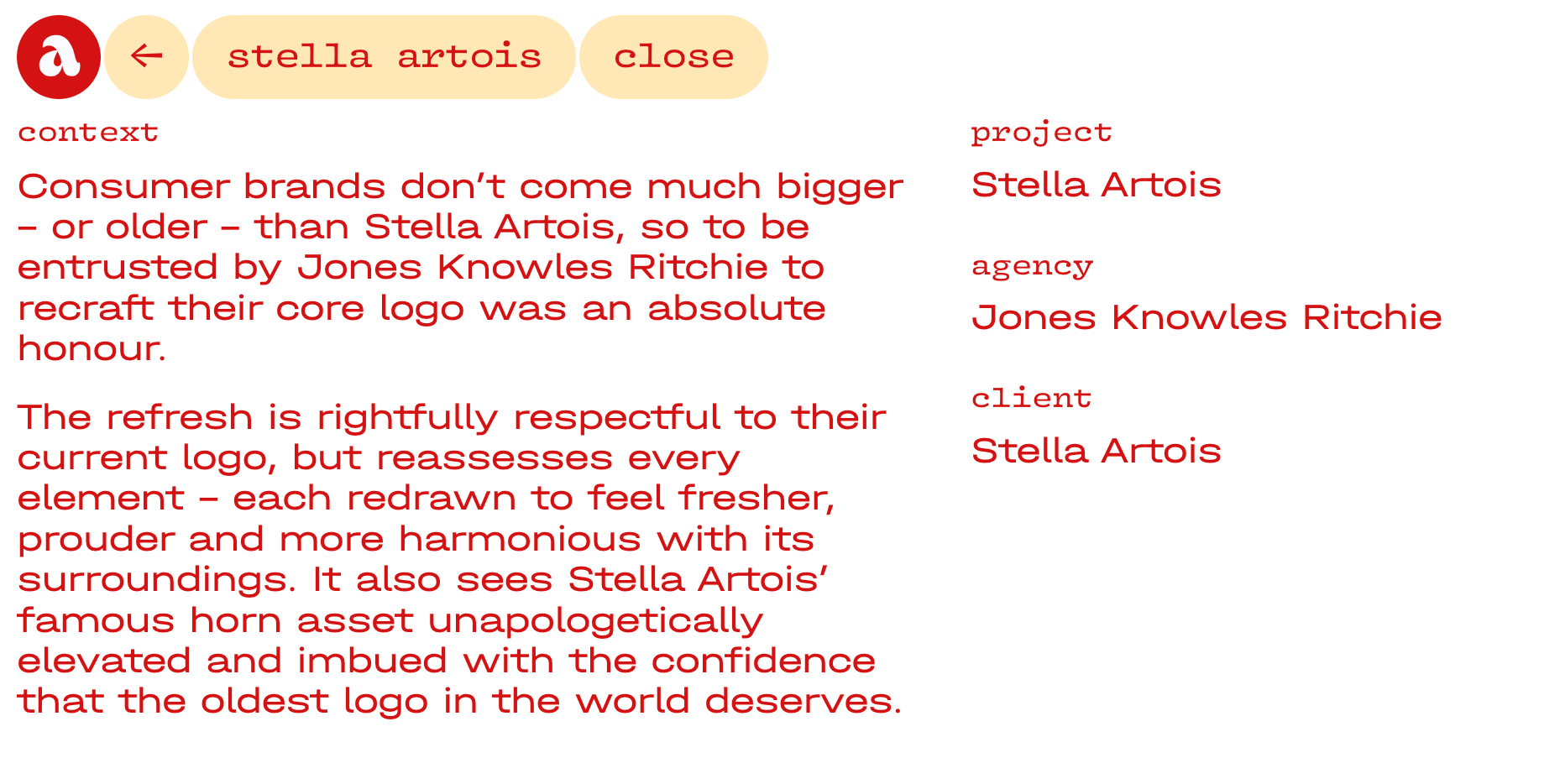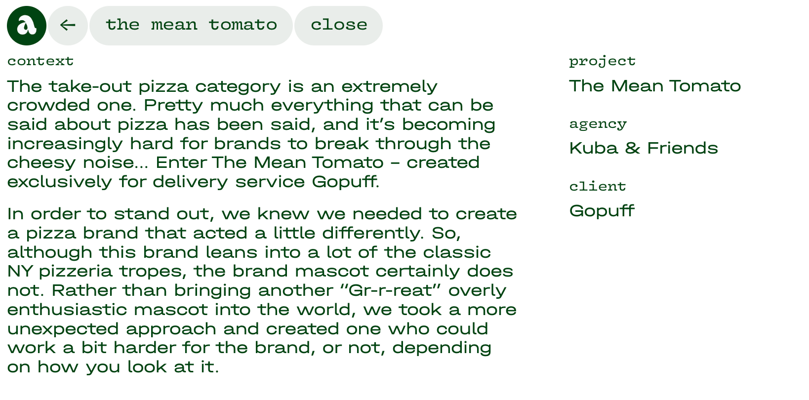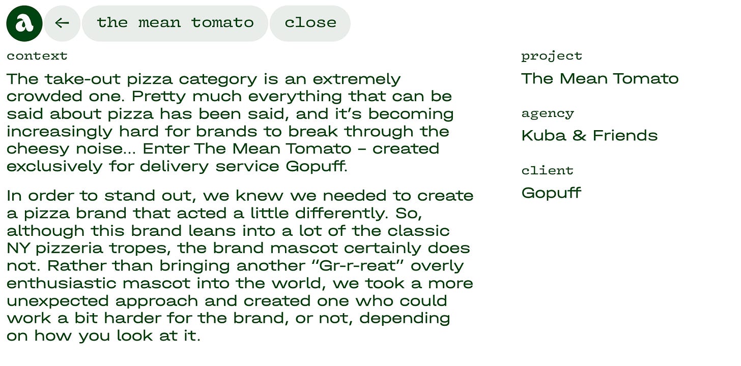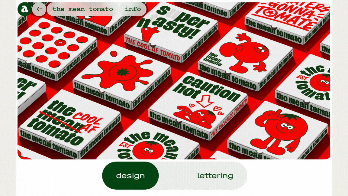 After a tiny scroll up and down through the portfolio projects I click on (what else?) The Mean Tomato. By now it’s not surprising to understand that the individual pages of Alex’s case studies are also characterized by confidence, control, and concept.