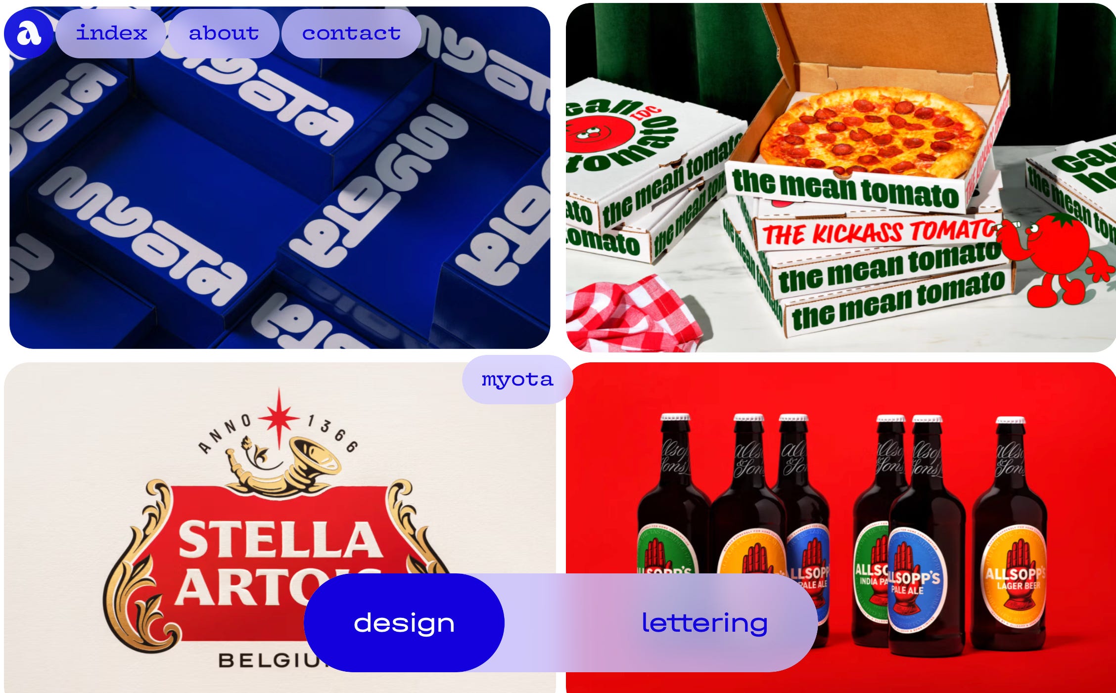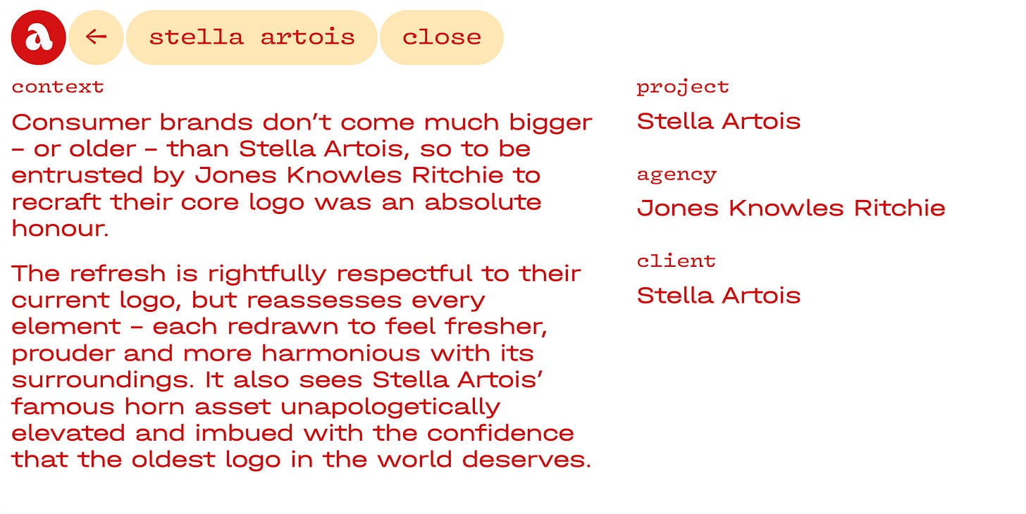 Harmony reigns. Hover-over tooltips display brand names without overstimulating the senses. Again a flicker of interaction. The now familiar ‘design — lettering’ toggle floats calmly at the bottom of the page, removing any fears we may have of having to gracelessly backpedal to the previous page to see Tear’s lettering work.