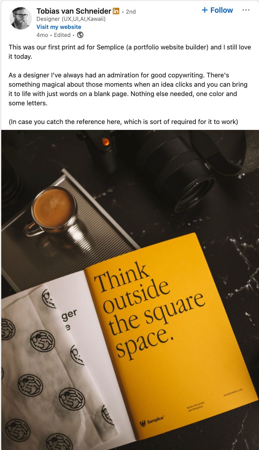 In a world where LinkedIn algorithms encourage us to file ourselves down to a strict narrow lane, we can take inspiration from this literal body of work. Is he insanely prolific? Looks like. But he also shows us that everything can be creative. And that repetition is key to cementing a brand. There are plenty of gold nuggets I’ve seen on a recurring basis from his universe.