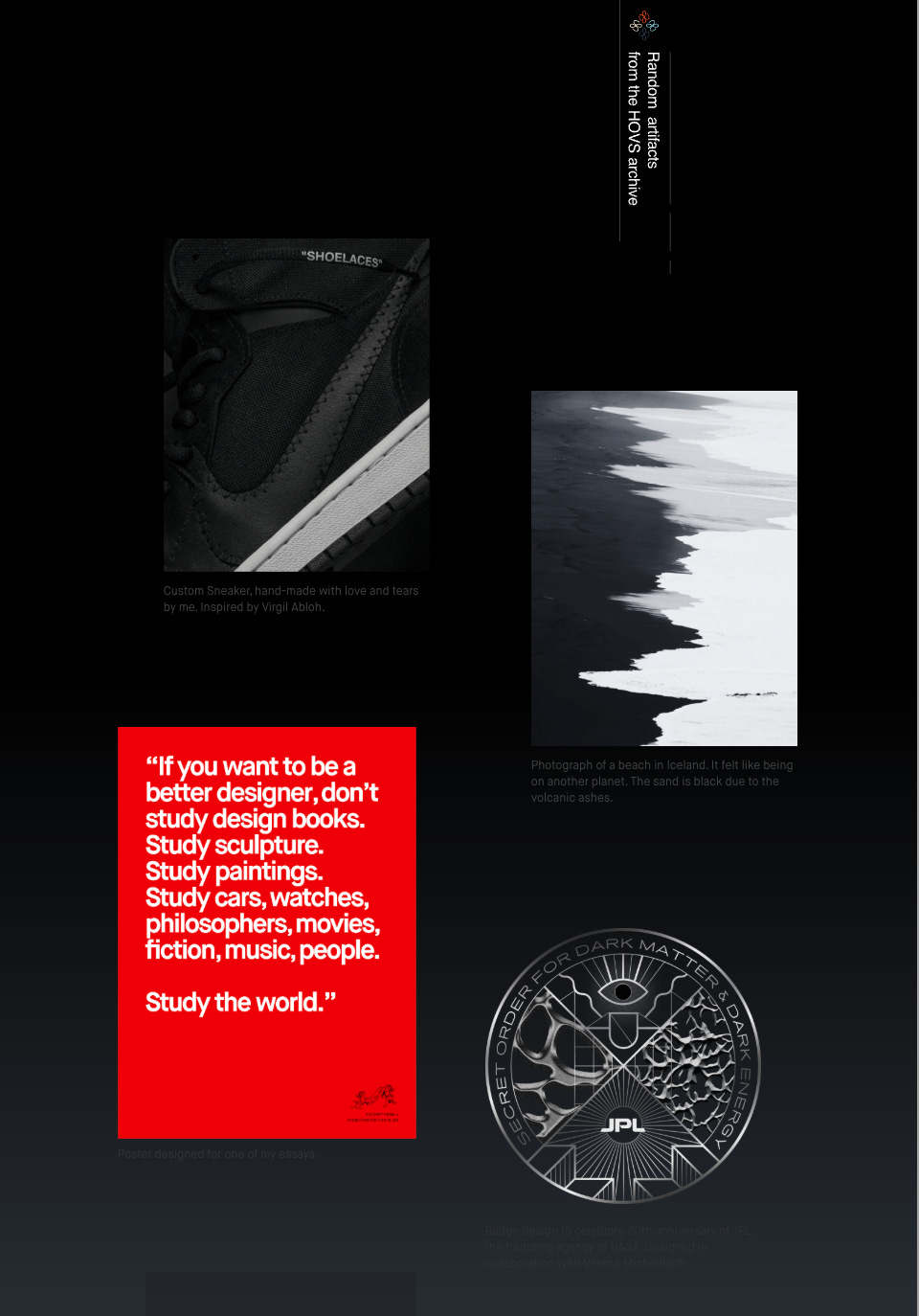After a touch of name-dropping (NASA/JPL), a nod to product development, and a teaser on life philosophy elegantly delivered in a few sentences, the ball is in our court. After this bio I feel less like I was stepping into a portfolio and more like I was entering a retrospective.